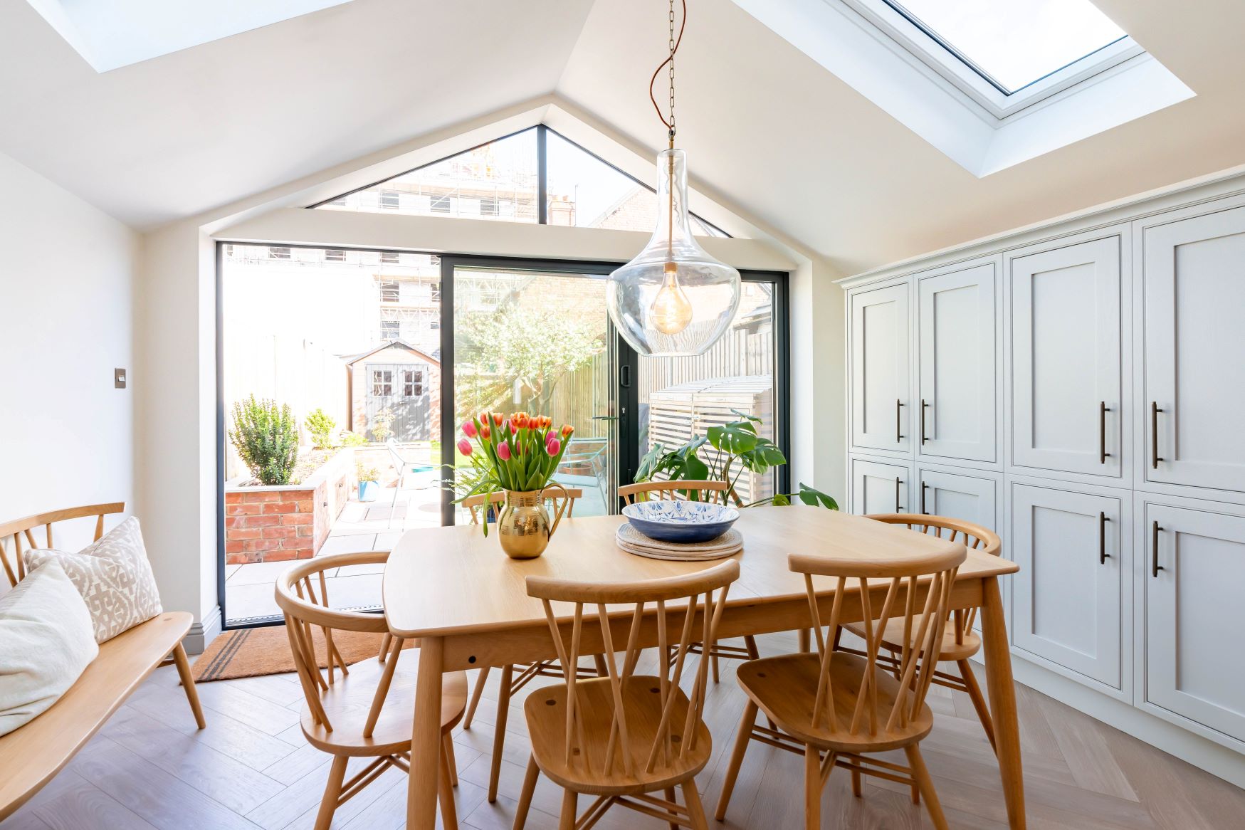 The extension creates a dining room and links the kitchen and rear reception rooms. Light pours in from the roof windows above.